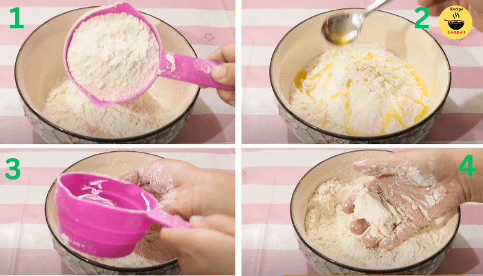 - To make Dough, take a mixing bowl or a Parat. Add a cup of Maida/Plain flour, a pinch of salt.