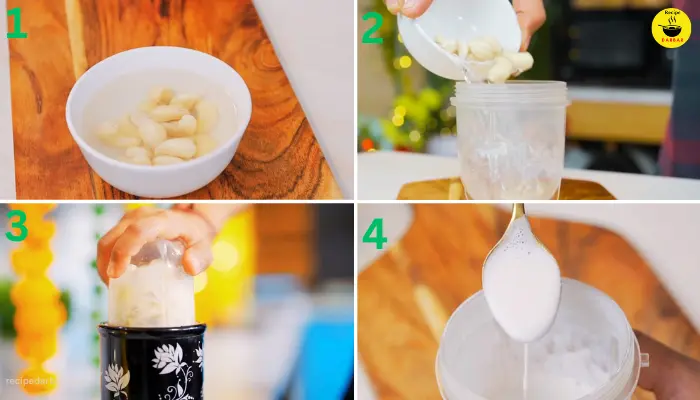 - Next, grind the soaked cashews in the blending jar and grind them into a fine paste. Keep this cashew paste ready for later – it adds luxurious richness to the curry.