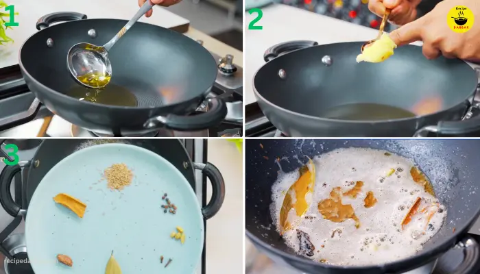 - Heat a pan with 2 tbsp of oil and melt 1 tbsp of butter on a low flame. Add all whole spices, such as cumin Seeds, Black Peppercorns, green cardamom, cloves, bay leaf, black cardamom, and cinnamon stick. Let the spices sizzle for 30 seconds to release their aroma.