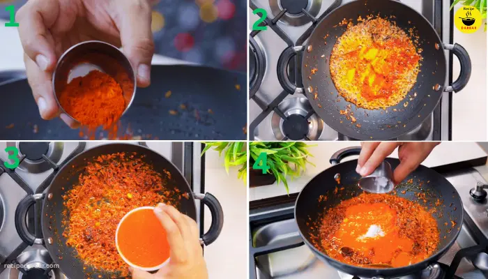 - Then add Kashmiri red chilli powder and turmeric powder. Cook for a couple of minutes. This will give the curry a nice red colour.