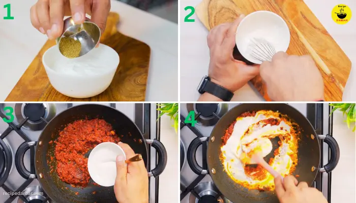 - The tomato gravy is well-cooked. Lower the flame and slowly add the prepared curd mixture to the gravy, and continuously stir to prevent splitting.