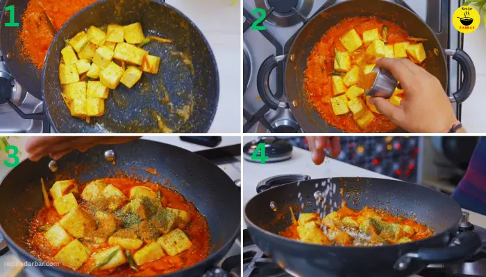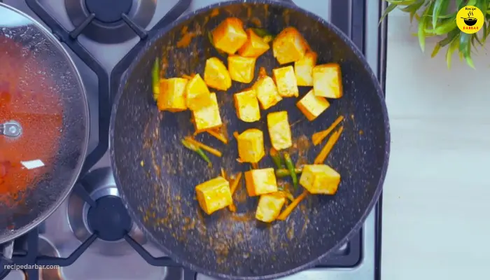 - Return to the gravy pan. Transfer the fried paneer to the pan.