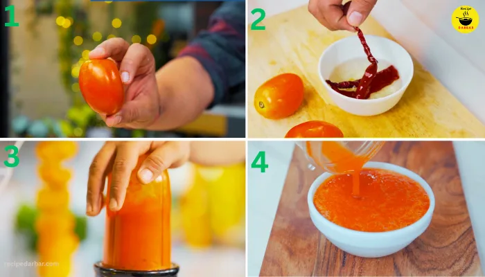 - Start by adding the tomato and the soaked red chillies into a blender. jar. Cover with the lid and blend until you get a smooth paste — this will give the gravy a creamy, rich texture.